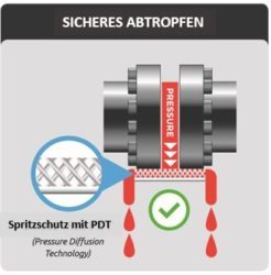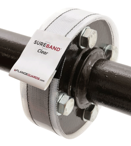 SUREBANDclear Spritzschutzbänder sind der wirkungsvollste und am schnellsten zu montierende Spritzschutz im Markt. Die Flangeguards PDT-Techologie, die bei SUREBANDClear jetzt auch im Kunststoffbereich umgesetzt wurde, ist der wirkungsvollste Spritzschutz und garantiert im Schadensfall den vollständigen Druckabbau innerhalb des Spritzschutzbandes! Im Schadensfall austretende Flüssigkeit spritzt nicht mehr aus dem Leck, sondern tropft sicher aus dem Spritzschutzband. Seitliche Spray-outs und gefährliche Nebelbildung werden zuverlässig verhindert. Spritzschutzlösungen bilden das letzte Glied in der Kette von Sicherungsmaßnahmen gegen gefährliche Spray-outs. Sie verhindern nicht den Produktaustritt, reduzieren aber deutlich das Gefährdungspotential für Mensch und Umwelt!